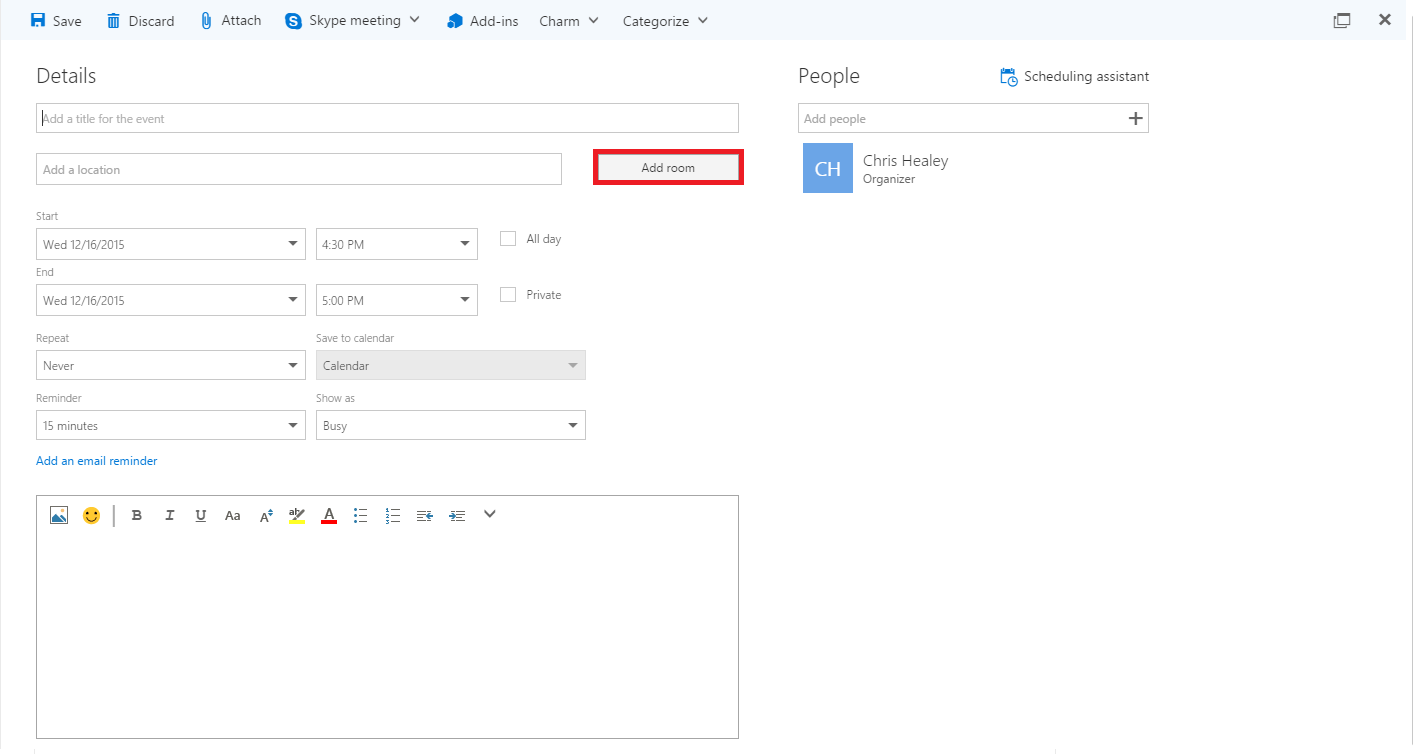 Select the button in the top left corner and select Calendar ![]() Select New in the top left corner ![]() Fill out the necessary information To book a room Select the Add room button and pick which room you will be meeting in ![]() To add other people to your meeting enter their email address in the people box in the top right corner ![]() When you have filled out all of the necessary information select Save in the top left corner |