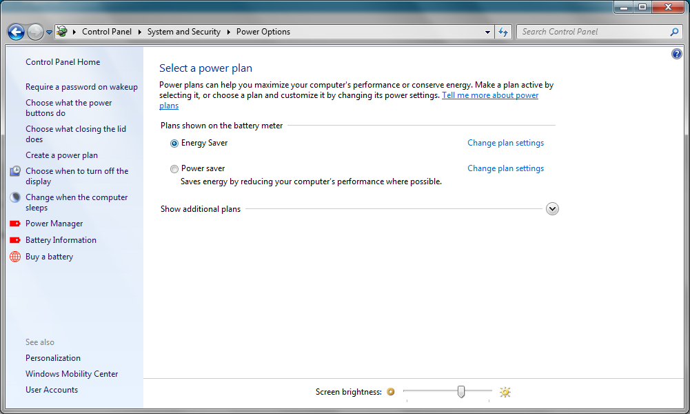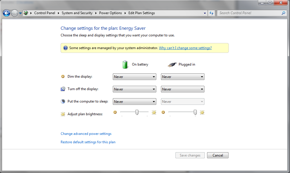 Check the Energy Saver box ![]() Select Change plan settings Adjust each of the settings to the way you want them (If you never want your computer to go into Sleep mode change all fields to Never) ![]() When you are finished select Save changes |